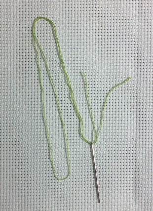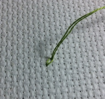 Step 1: Cut a piece of floss double the length that you would normally work with. Separate out a single strand of floss. Fold the floss in half and thread the open end through the needle.